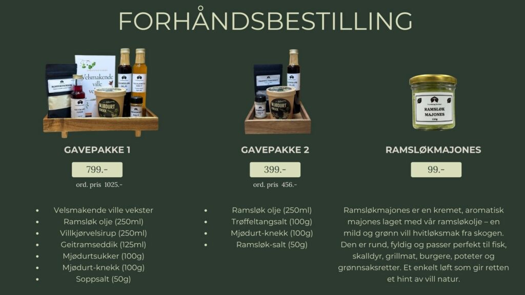 Til julemarkedet har vi tatt med et utvalg av det vi lager og jobber med til daglig: bøker om sanking, siruper til drinker og desserter, smaksatte eddiker, syltede ville råvarer, tang og tare, sopp, krydder og smakspulver, ramsløkolje og gavepakker fylt med vill matglede. Alt du finner hos oss er laget med samme håndverk og råvarer som brukes i profesjonelle kjøkken – bare pakket inn i en litt mer tilgjengelig form.